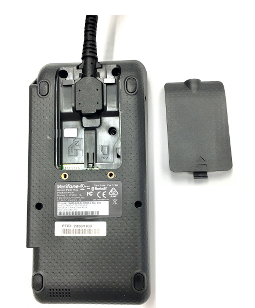 Remove the cover from the back of the payment terminal by sliding it in the direction indicated by the arrow.